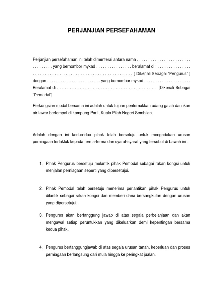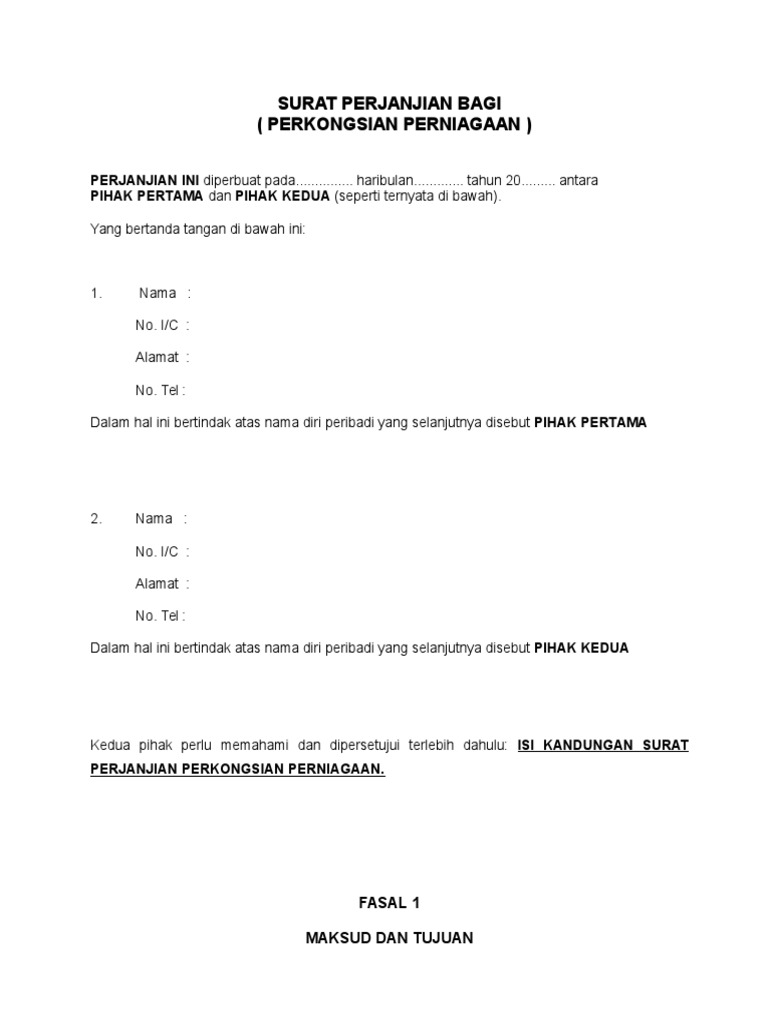 Menguruskan perniagaan tersebut mengikut penguatkuasaan di dalam persekutuan malaysia. 25 mac contoh perjanjian perkongsian (partnership aggreement) dan lain2 mesti dinyatakan dalam perjanjian tersebut. Pastikan anda baca sampai akhir pembahasan kami. Contoh surat perjanjian kerjasama diperlukan untuk anda yang ingin membuat surat perjanjian bisnis. Definisi surat perjanjian adalah salah satu surat resmi yang didalamnya mengatur tentang hak dan kewajiban 2 (dua) orang atau lebih yang akan melakukan sebuah kesepakatan atas.